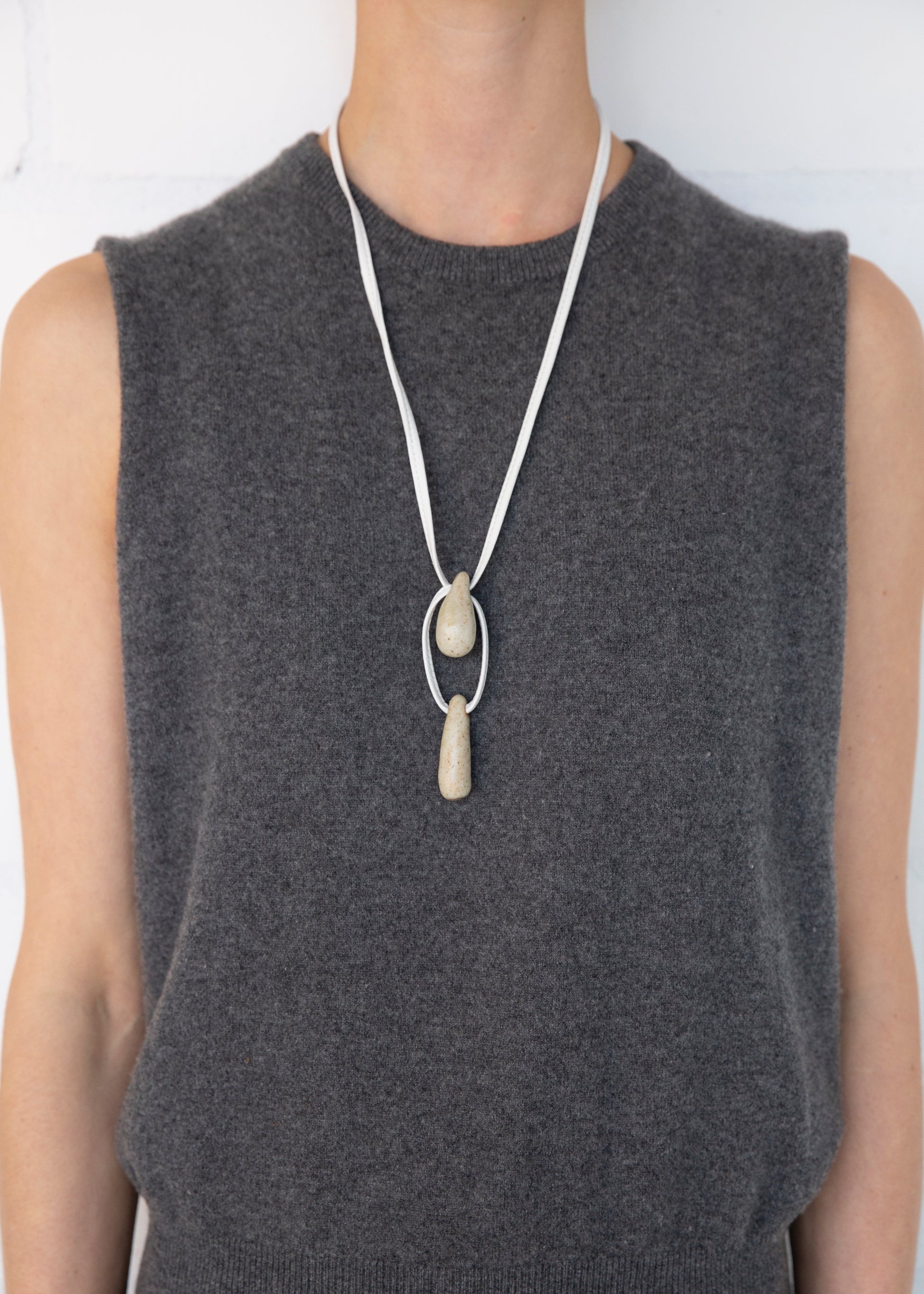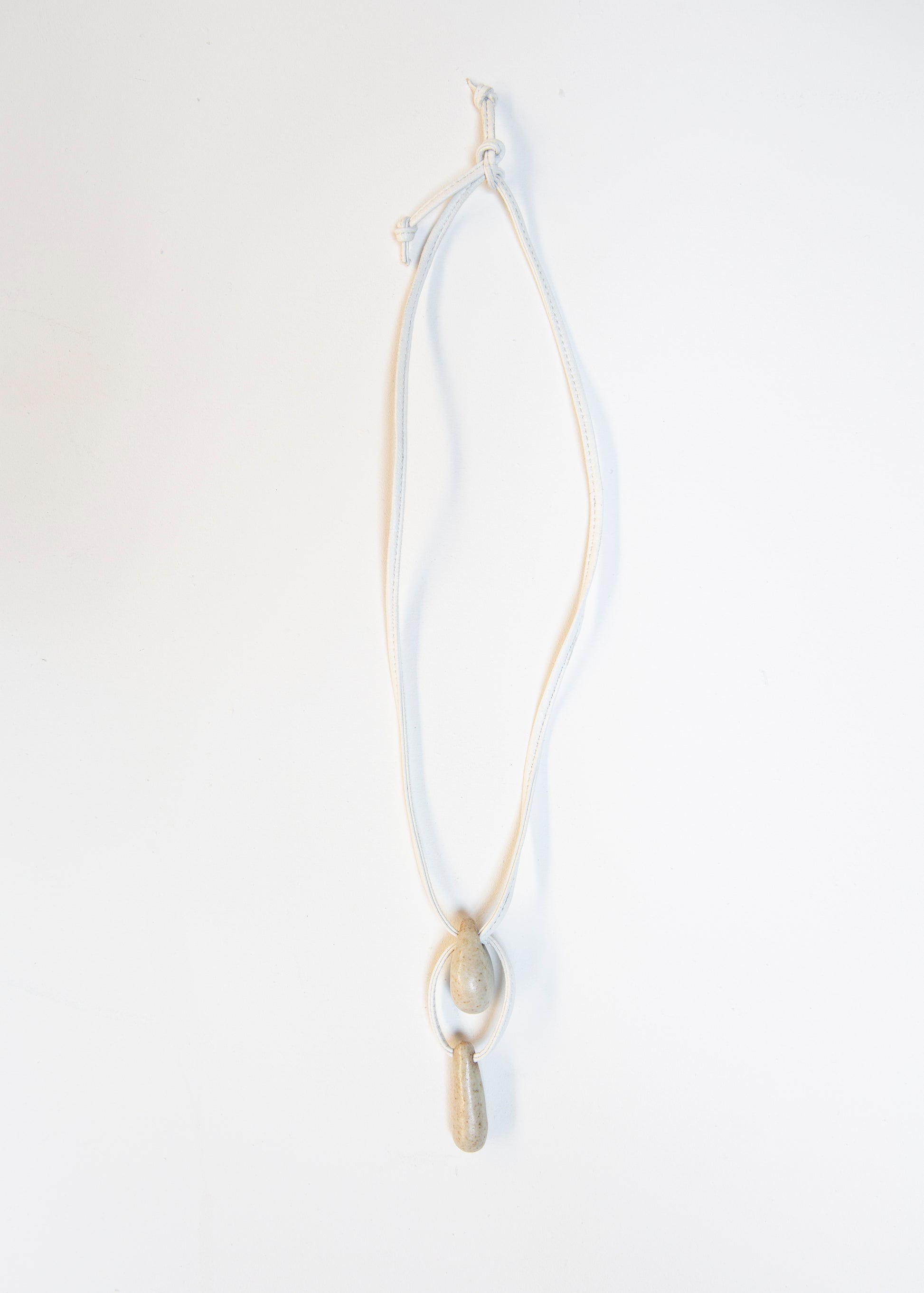 A handmade ceramic necklace. Each piece is one-of-one, finished with a 100% natural wood-ash glaze.