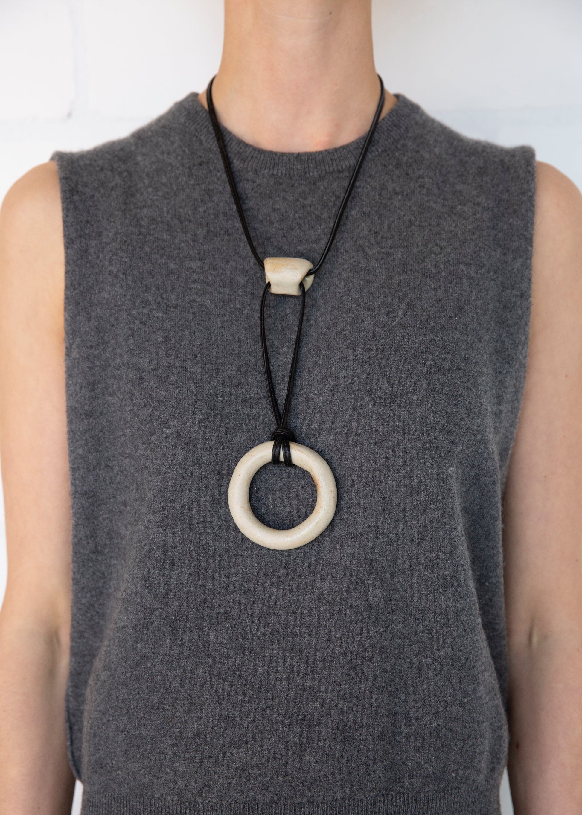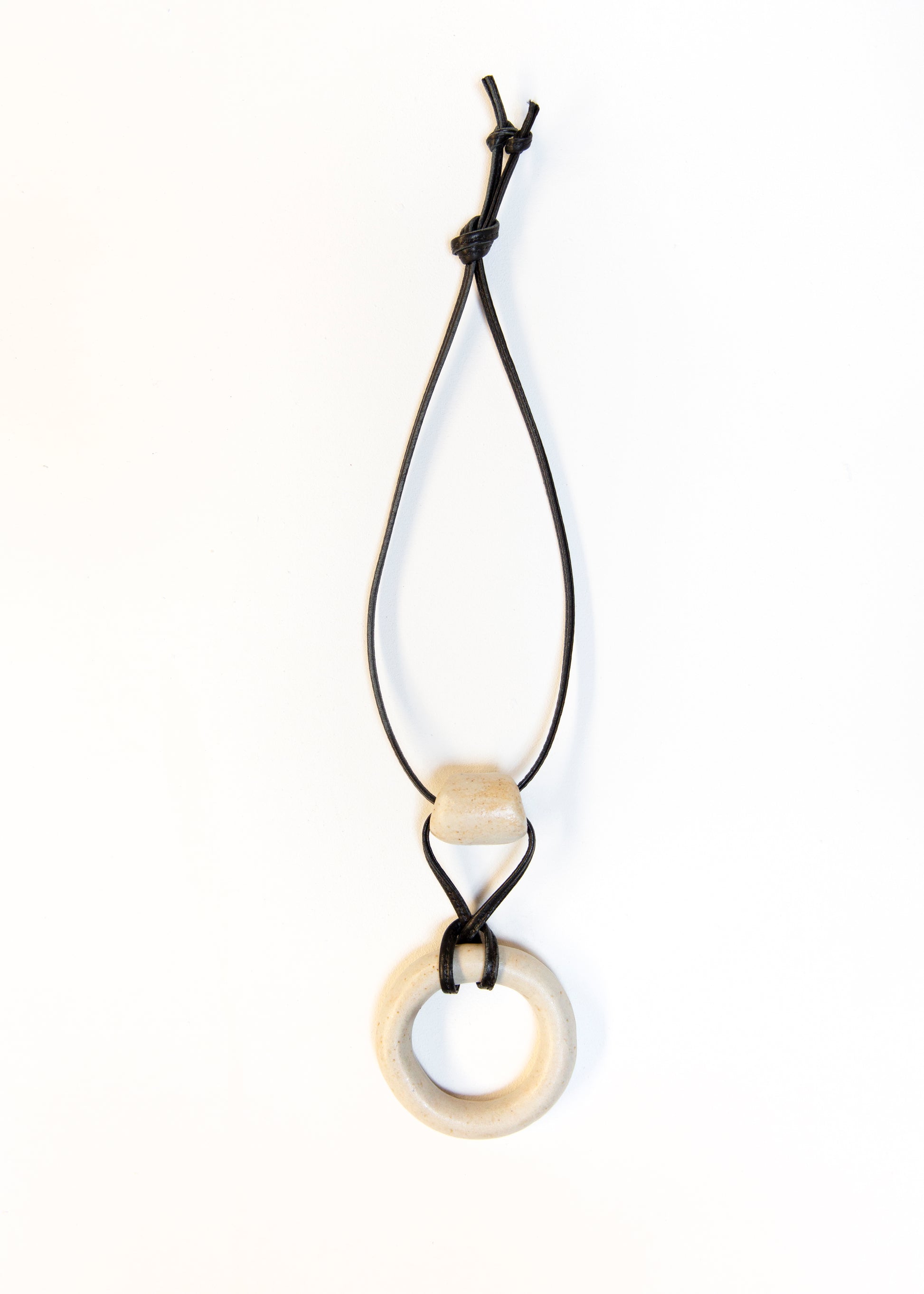 A handmade ceramic necklace. Each piece is one-of-one, finished with a 100% natural wood-ash glaze.