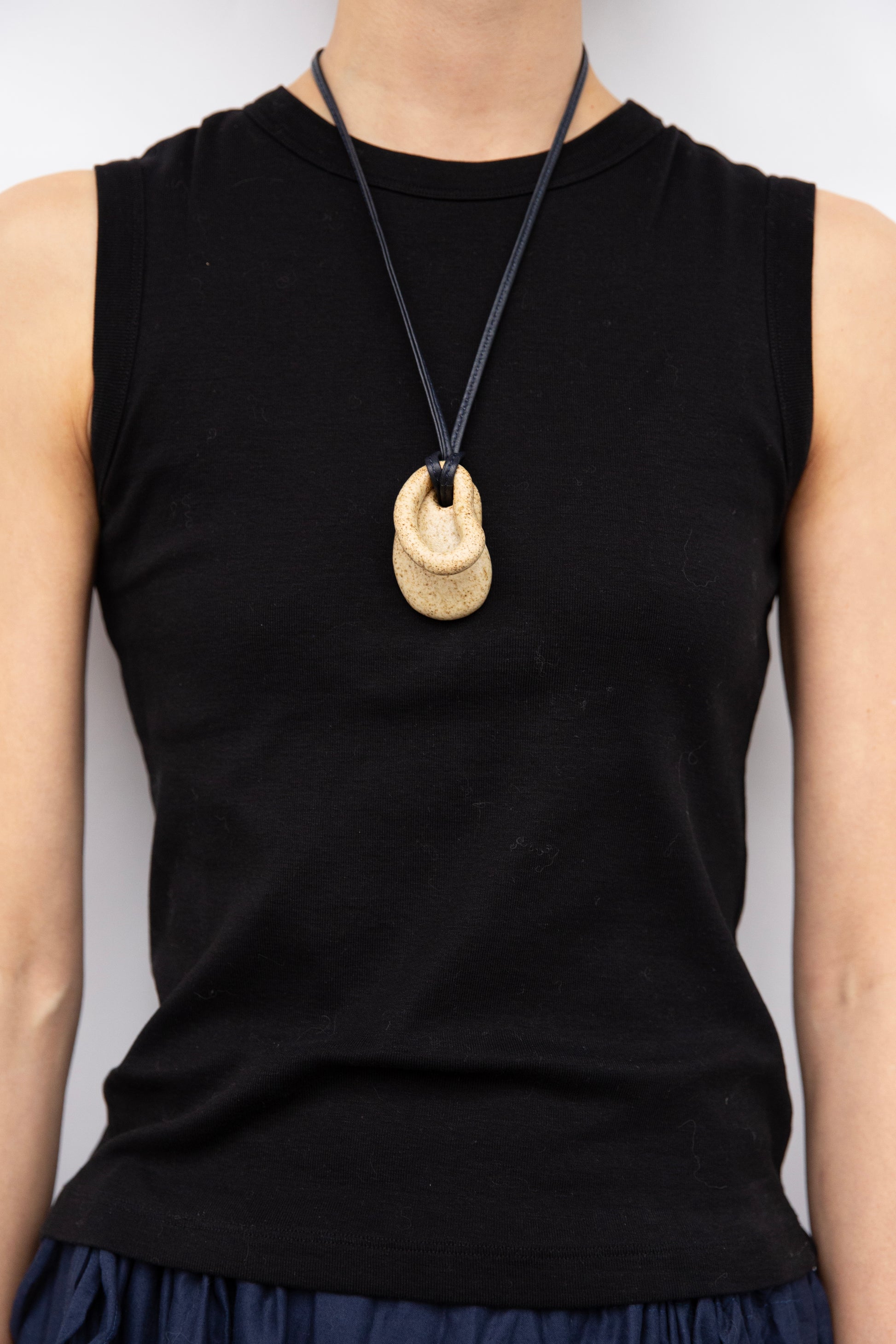 A handmade ceramic necklace. Each piece is one-of-one, finished with a 100% natural wood-ash glaze.
