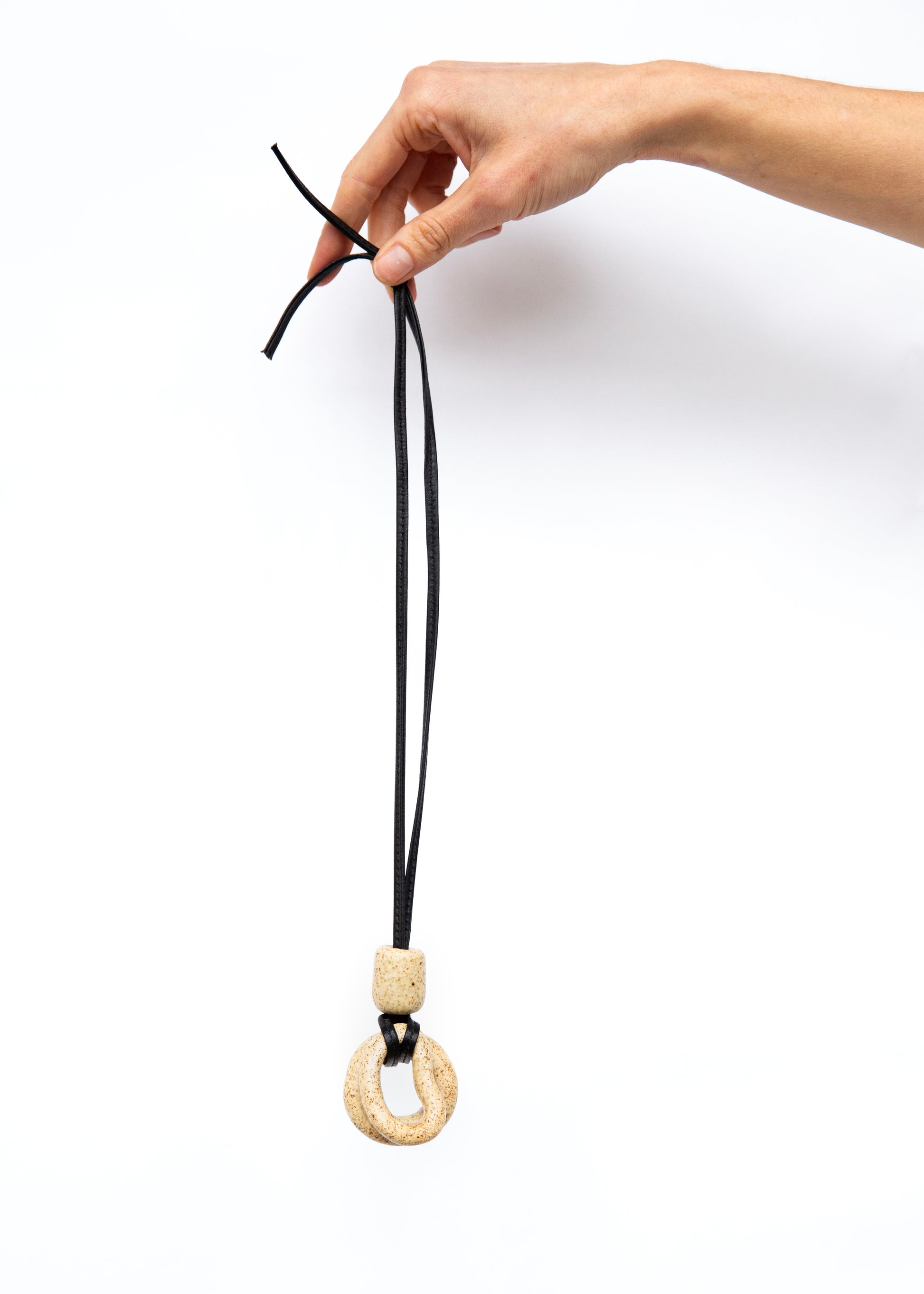 A handmade ceramic necklace. Each piece is one-of-one, finished with a 100% natural wood-ash glaze.