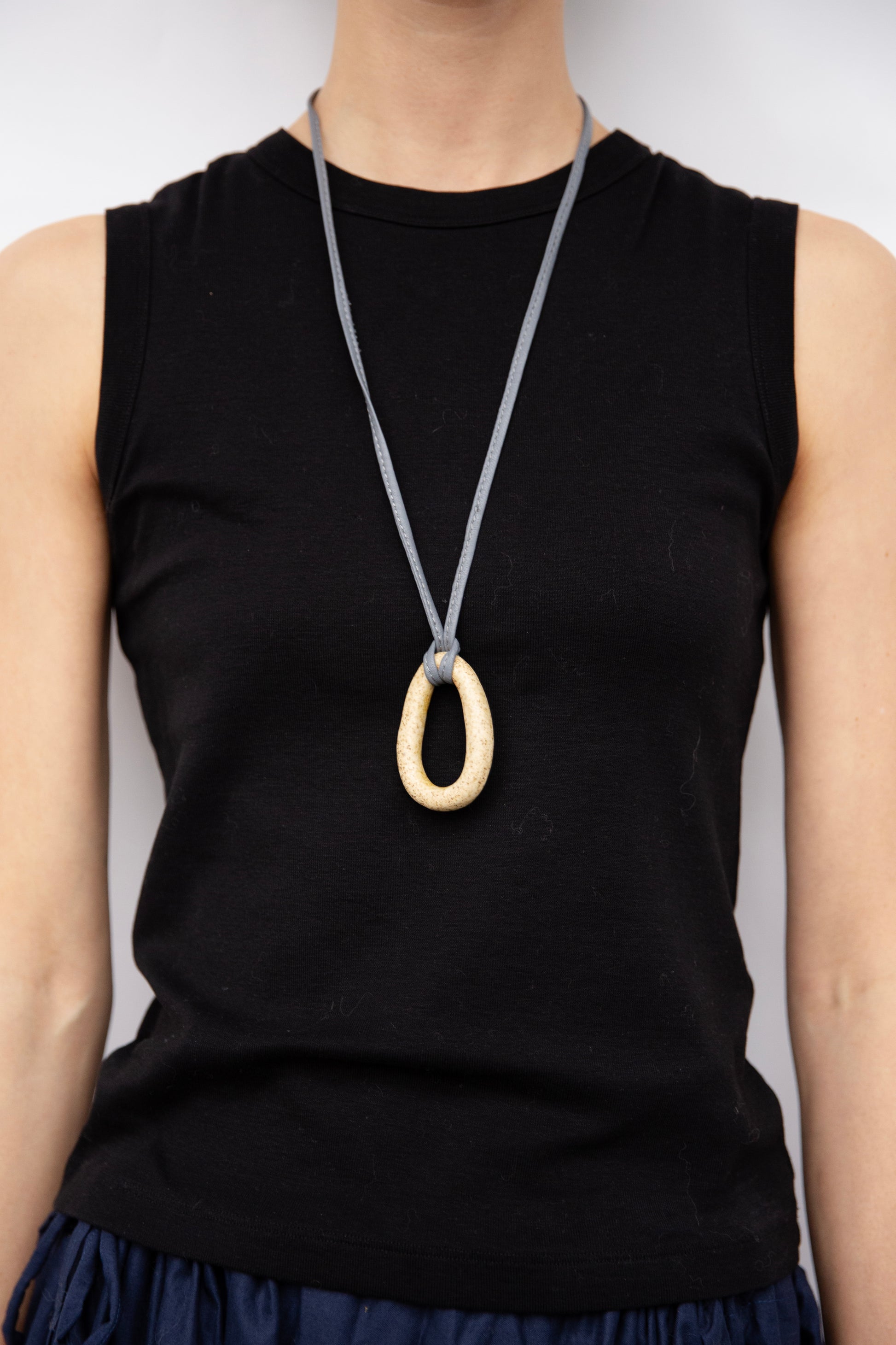 A handmade ceramic necklace. Each piece is one-of-one, finished with a 100% natural wood-ash glaze.