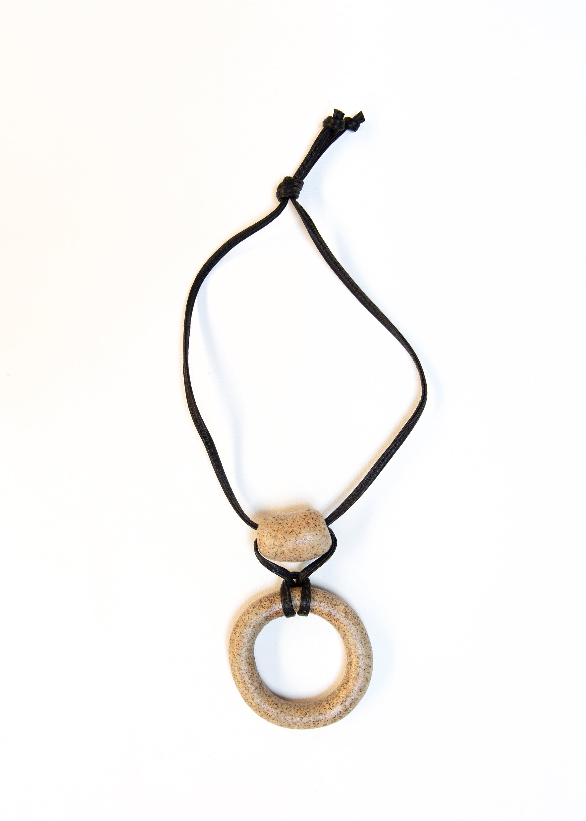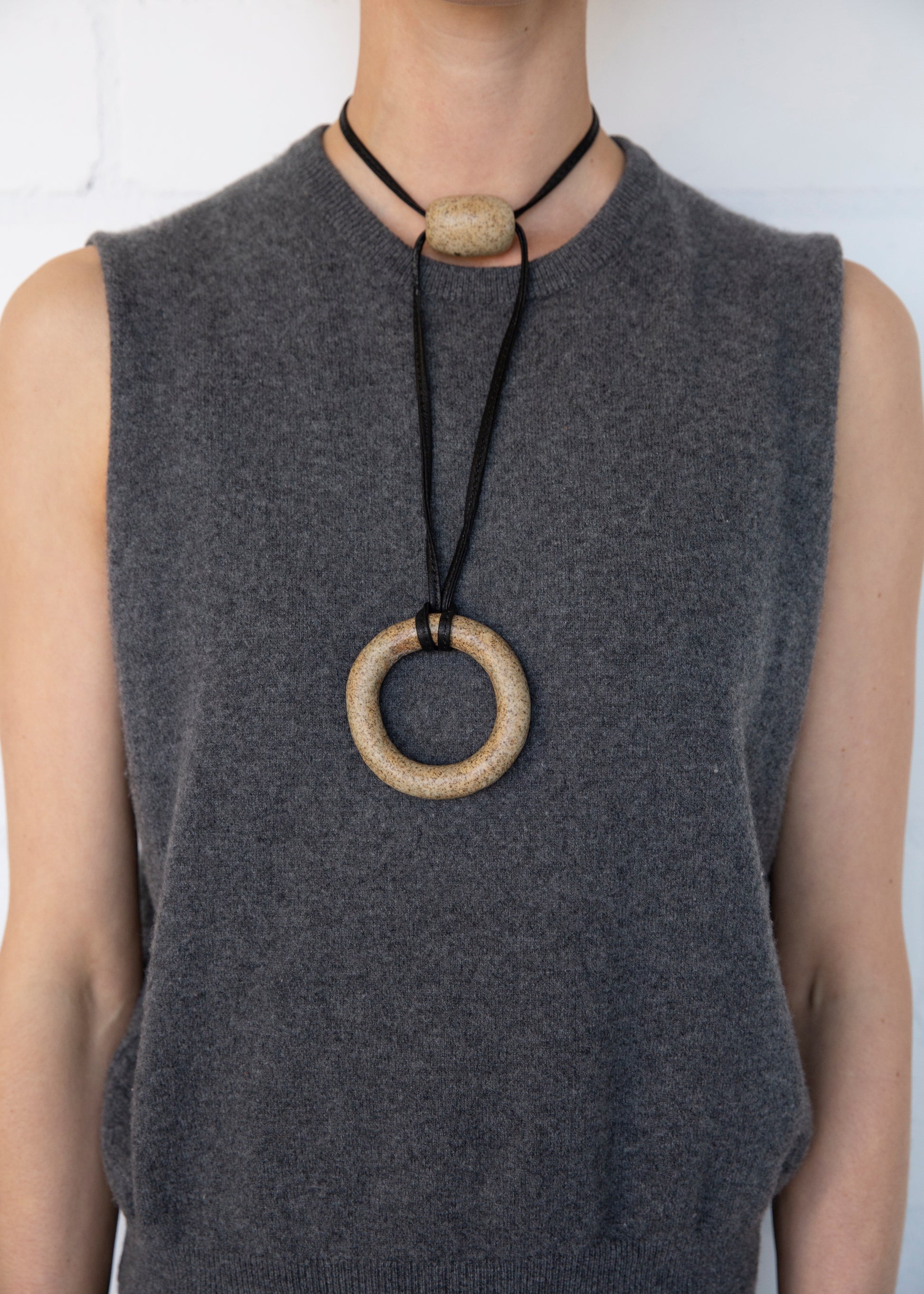 A handmade ceramic necklace. Each piece is one-of-one, finished with a 100% natural wood-ash glaze.