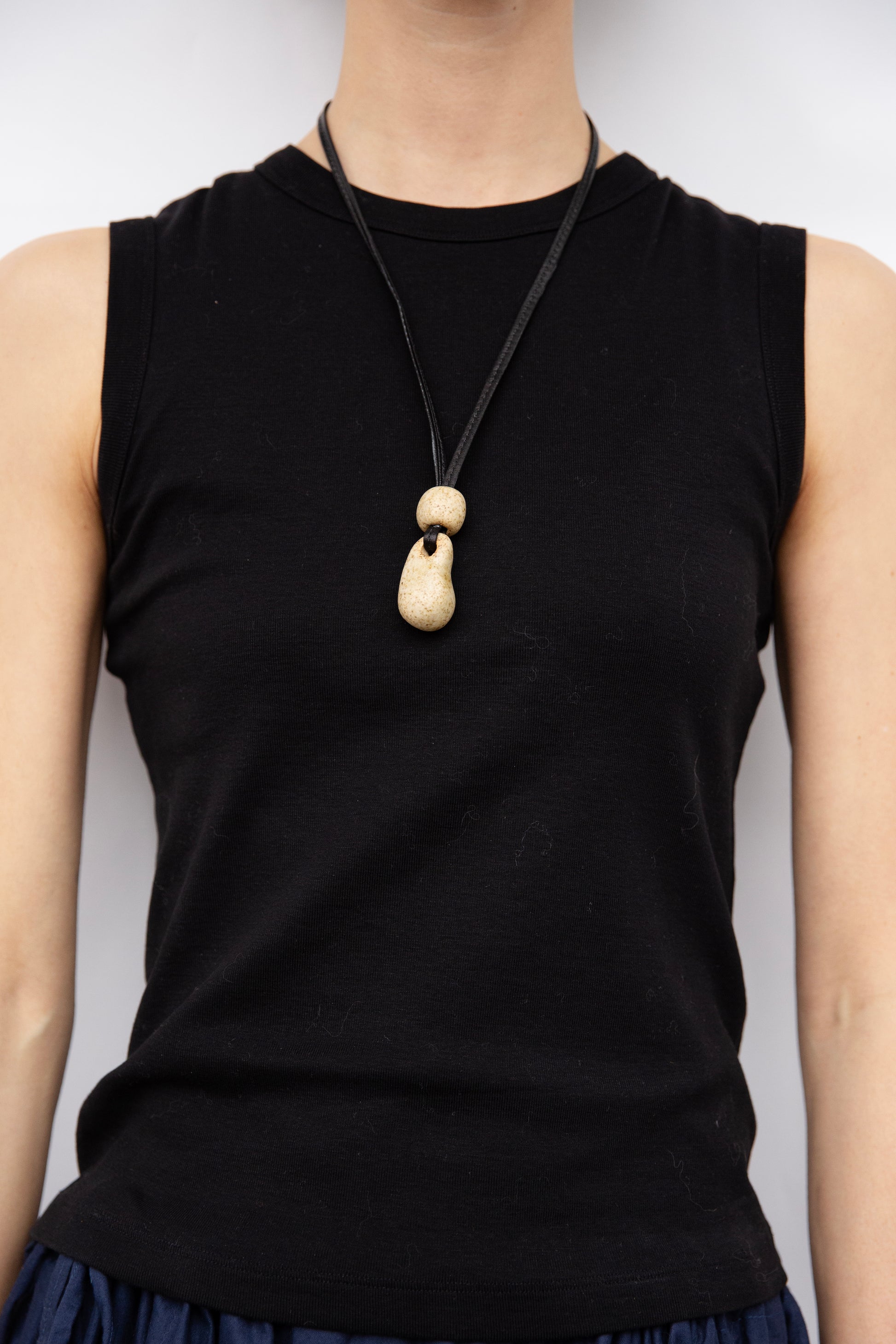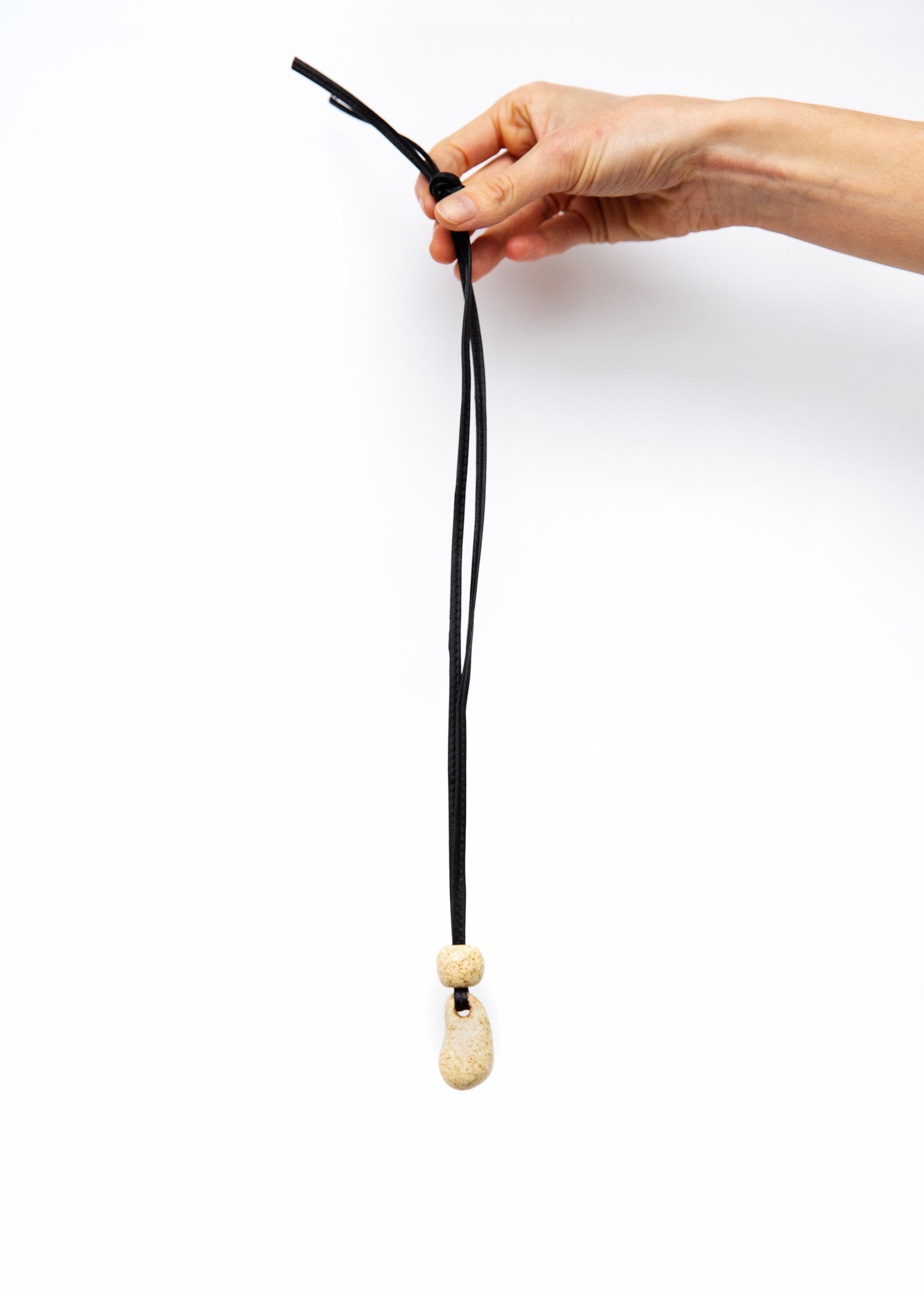 A handmade ceramic necklace. Each piece is one-of-one, finished with a 100% natural wood-ash glaze.