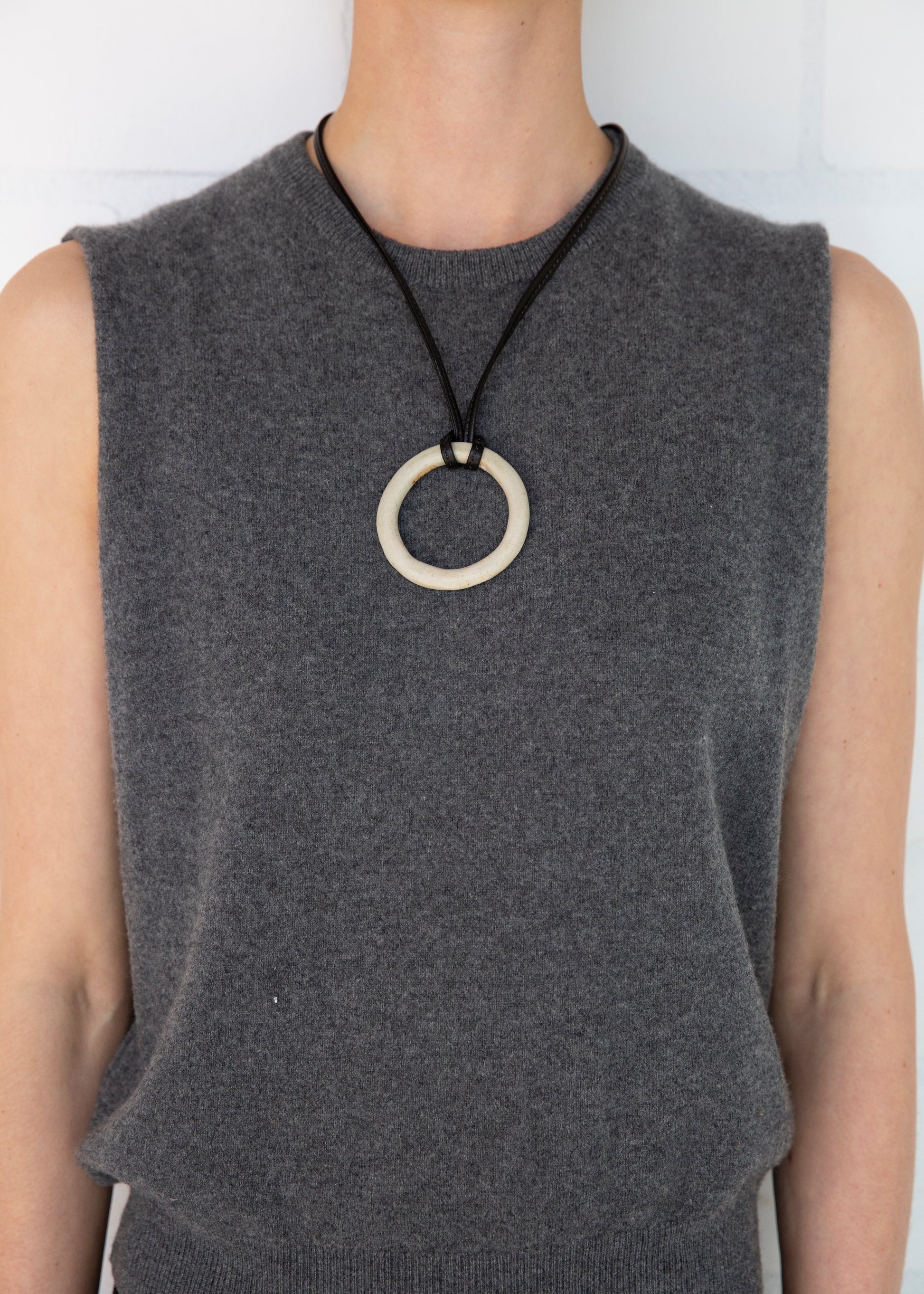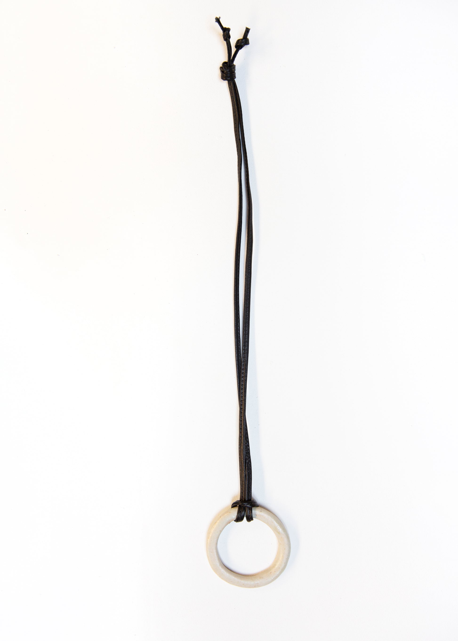 A handmade ceramic necklace. Each piece is one-of-one, finished with a 100% natural wood-ash glaze.