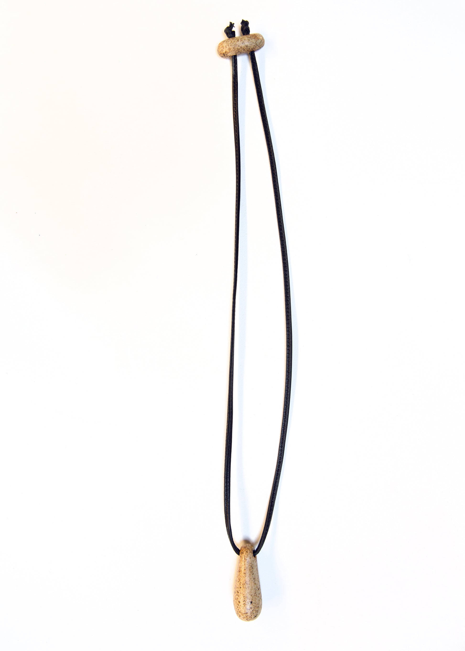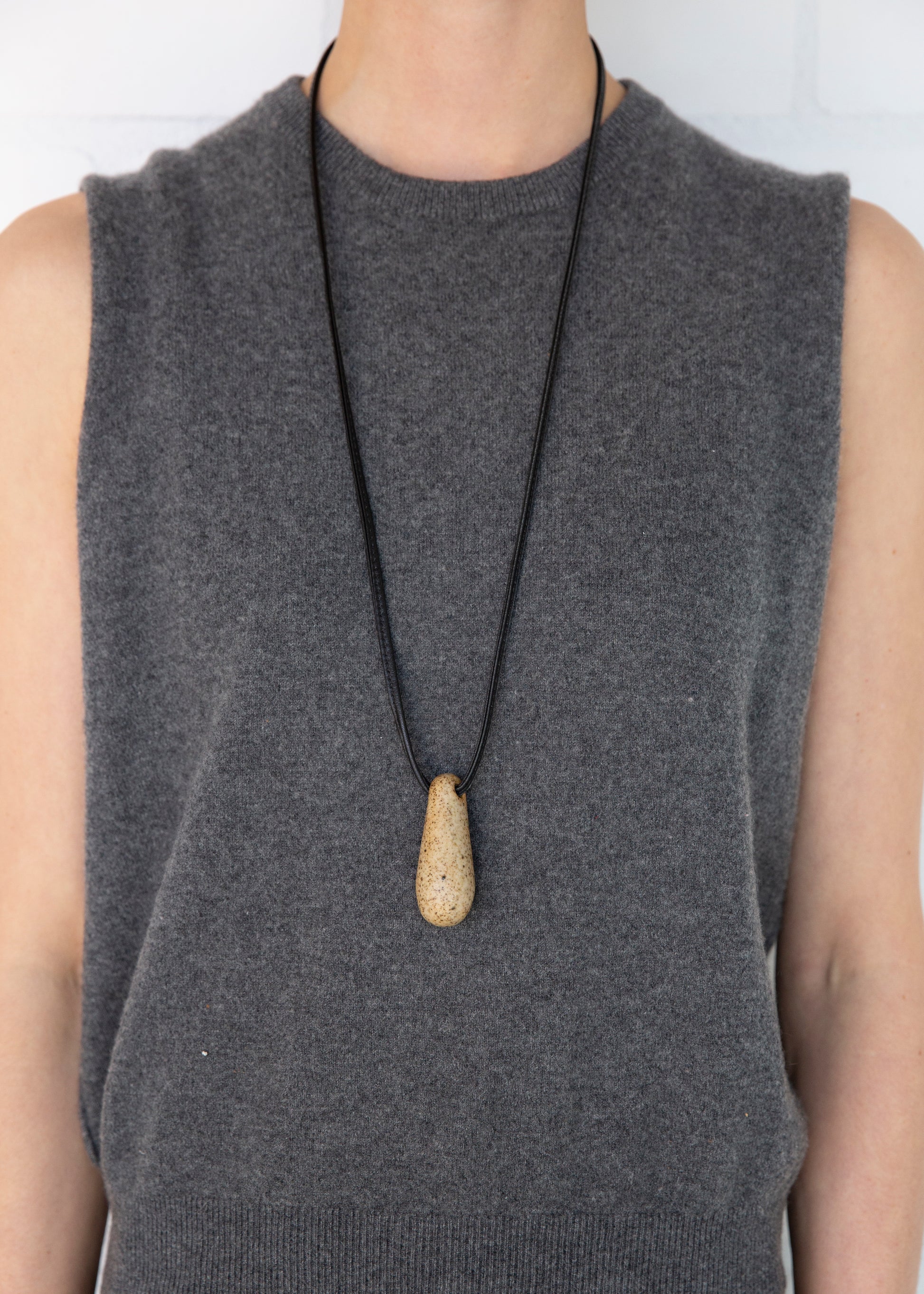 A handmade ceramic necklace. Each piece is one-of-one, finished with a 100% natural wood-ash glaze.